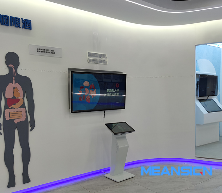在館內每個主題展區空閑區域,放置臥式觸摸一體機,以人機交互的方式,為觀眾提供趣味性、互動性、科學性、安全性的體驗,提高觀眾的參與度,深入了解生命健康原理,自動查詢健康知識、健康技能。